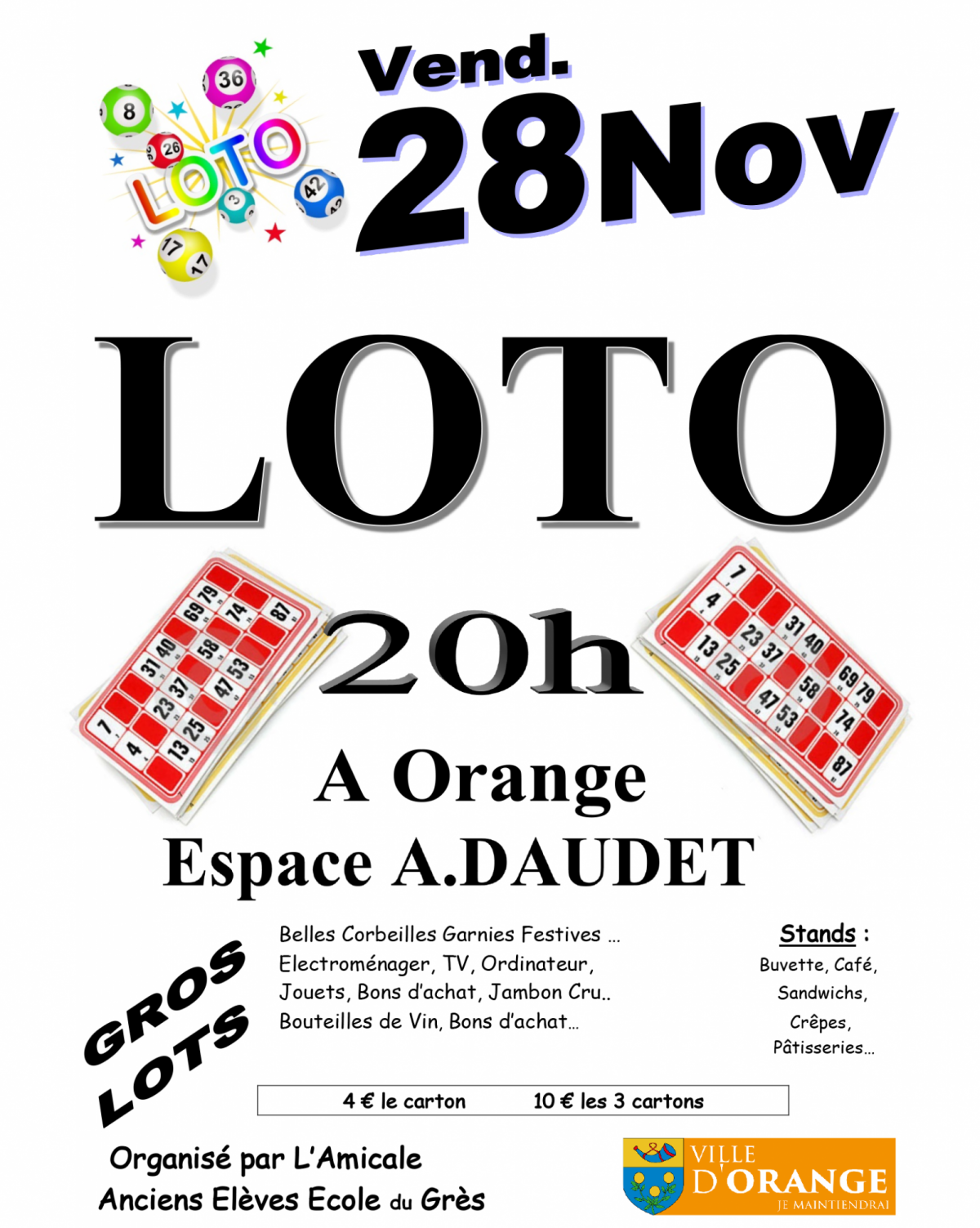 L’Amicale des 𝗔𝗻𝗰𝗶𝗲𝗻𝘀 𝗘́𝗹𝗲̀𝘃𝗲𝘀 𝗱𝗲 𝗹’𝗘́𝗰𝗼𝗹𝗲 𝗱𝘂 𝗚𝗿𝗲̀𝘀 organise un loto avec de beaux lots à la clé. Pour accompagner votre jeu, une buvette, du café et de délicieuses douceurs seront proposés. 🍪☕