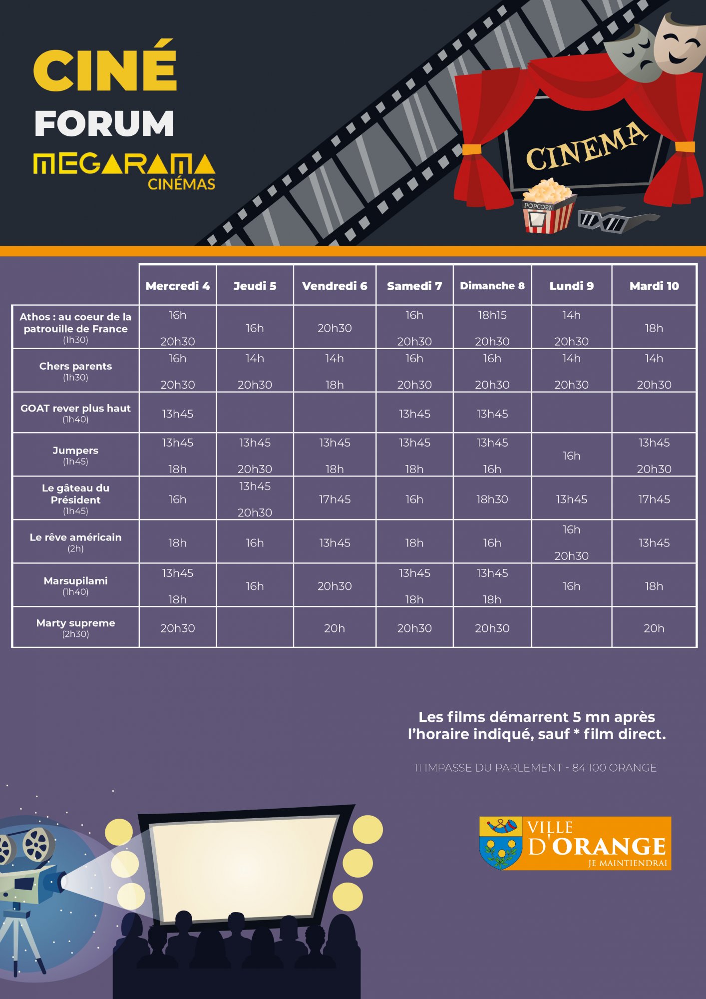 MARSUPILAMI (1h39) : Pour sauver son emploi, David accepte un plan foireux : ramener un mystérieux colis d’Amérique du Sud. Il se retrouve à bord d’une croisière avec son ex Tess, son fils Léo, et son collègue Stéphane, aussi benêt que maladroit, dont David se sert pour transporter le colis à sa place. Tout dérape lorsque ce dernier l’ouvre accidentellement : un adorable bébé Marsupilami apparait et le voyage vire au chaos ! Avec Philippe Lacheau, Jamel Debbouze, Élodie Fontan… A partir de 6 ans.MARTY SUPREME (2h30) : Marty Mauser, un jeune homme à l’ambition démesurée, est prêt à tout pour réaliser son rêve et prouver au monde entier que rien ne lui est impossible. Avec Timothée Chalamet, Gwyneth Paltrow, Odessa A’zion...