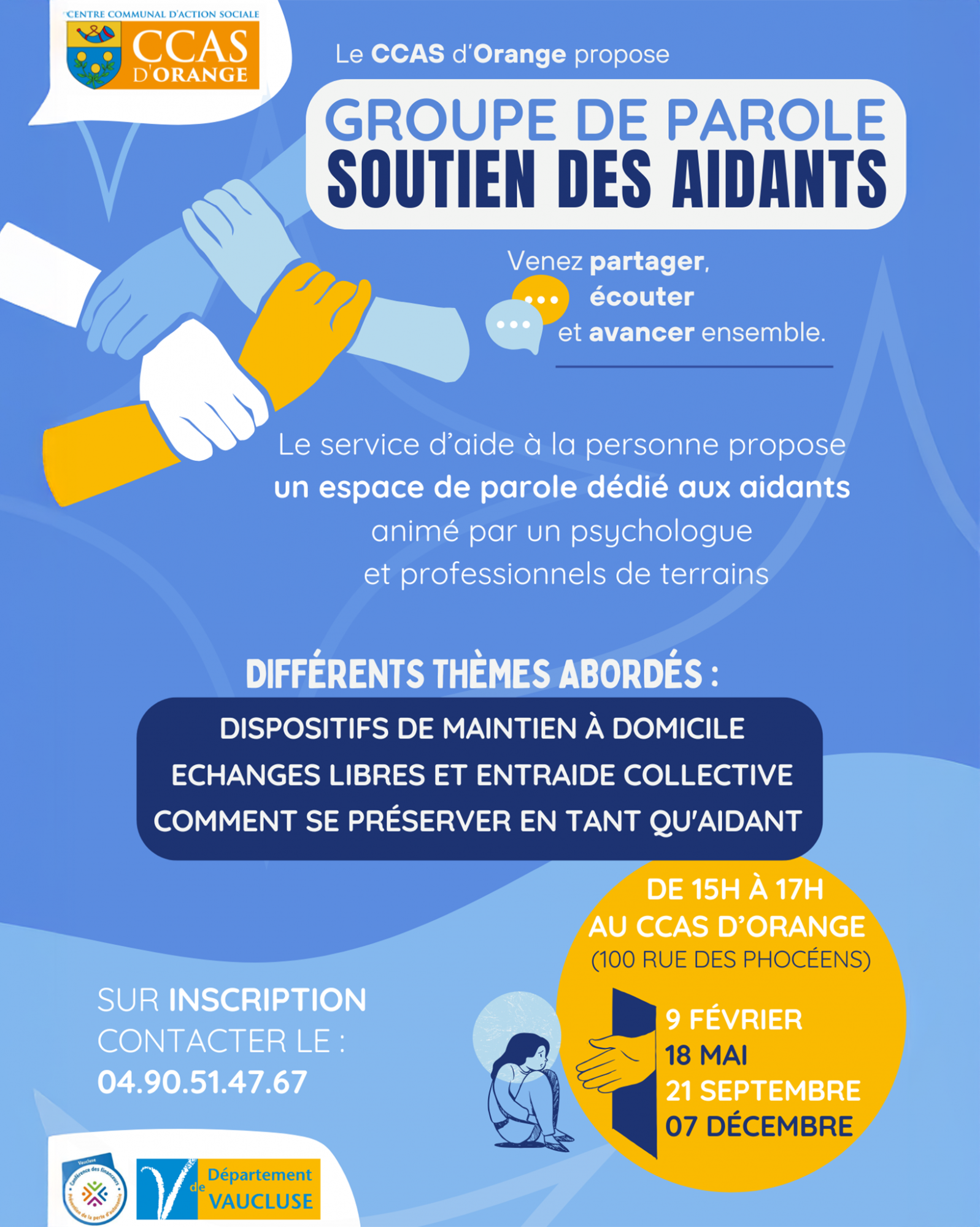 📞 04 90 51 47 67Le CCAS invite tous les aidants du quotidien à se retrouver pour 𝗲́𝗰𝗵𝗮𝗻𝗴𝗲𝗿, 𝘀’𝗲́𝗰𝗼𝘂𝘁𝗲𝗿 et 𝗮𝘃𝗮𝗻𝗰𝗲𝗿 𝗲𝗻𝘀𝗲𝗺𝗯𝗹𝗲, dans un cadre bienveillant. Différents thèmes seront abordés avec l’accompagnement de professionnels de santé. 🗣️